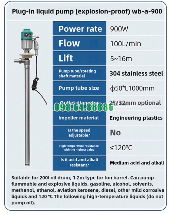 Máy bơm chất lỏng inox 304 chống cháy nổ WB-A-900 phiên bản 1m dùng cho thùng dầu 200 lít là thiết bị tối ưu cho nhu cầu bơm hút và sang chiết nhiên liệu trong công nghiệp. Với thiết kế phù hợp, hiệu suất mạnh mẽ và khả năng vận hành an toàn, WB-A-900 mang lại giải pháp toàn diện cho các doanh nghiệp sử dụng thùng phuy tiêu chuẩn.