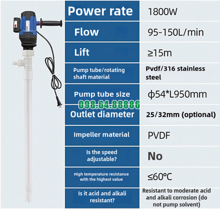 Khám phá những đặc điểm nổi bật của Máy bơm điện bơm chất lỏng thùng phuy JDT-1800W-PVDF