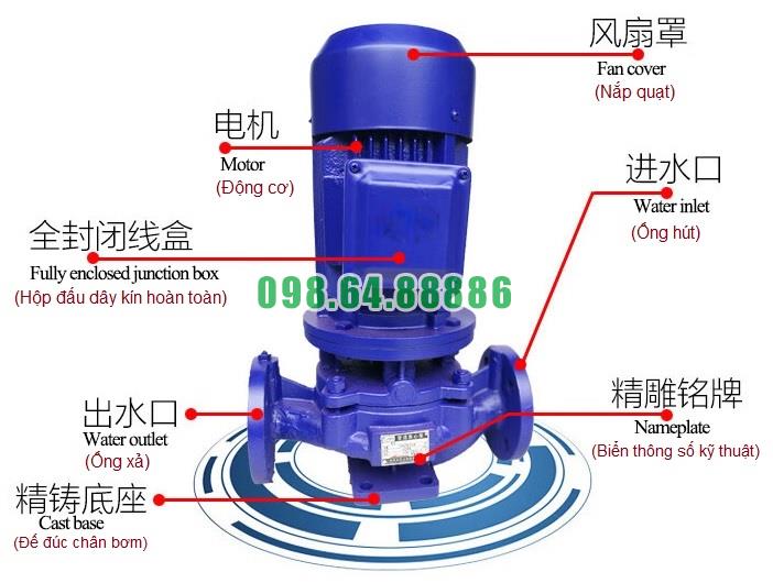 Máy bơm đồng trục thẳng đứng, bơm đa tầng cánh đứng ISG100-100, IRG100-100 5.5kw, 100m3, 12.5m