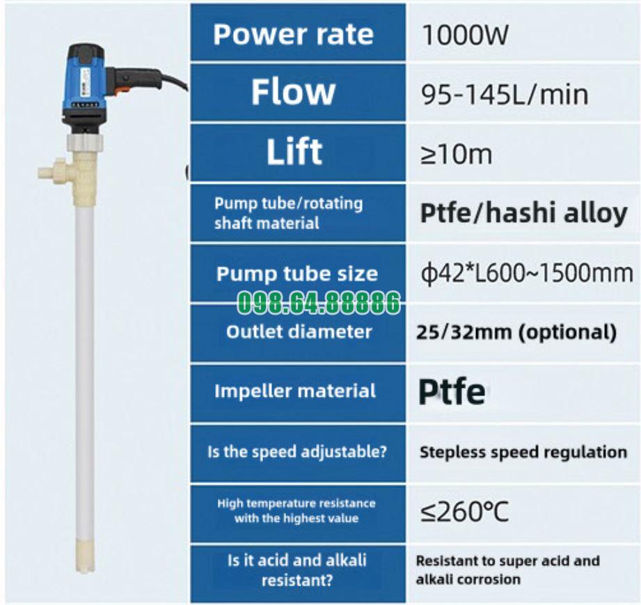 Bơm điện nhúng thùng phuy hóa chất chống ăn mòn model JDT-1000W-PTFE được ứng dụng chủ yếu để bơm các loại hóa chất có tính ăn mòn mạnh như axit, bazơ và dung môi công nghiệp. Vật liệu PTFE giúp bơm hoạt động ổn định, không bị ăn mòn hay biến dạng trong quá trình sử dụng lâu dài.