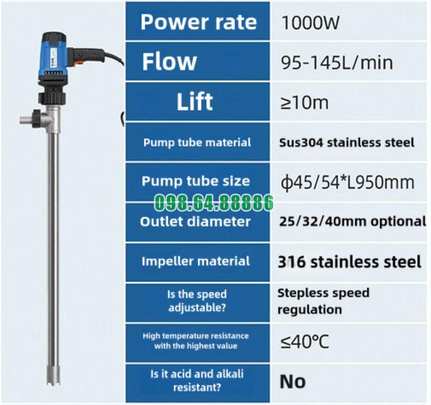 Ưu điểm về khả năng chống ăn mòn hóa chất của Bơm cắm điện thùng phuy JDT-1000W-304SUS thể hiện ở khả năng chịu được môi trường hóa chất, duy trì bề mặt ổn định, hạn chế phản ứng với môi chất và giảm nguy cơ rò rỉ. Đây là yếu tố then chốt giúp bơm vận hành an toàn, bền bỉ và phù hợp với các ứng dụng bơm hóa chất từ thùng phuy
