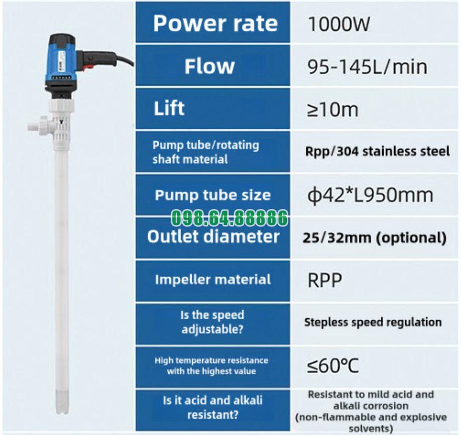 Với vật liệu PVDF cao cấp, hệ thống làm kín phù hợp và thiết kế tách biệt hóa chất hiệu quả, bơm cắm điện thùng phuy model JDT-1000W-PVDF sở hữu ưu điểm chịu hóa chất cực mạnh, giúp thiết bị vận hành bền bỉ, an toàn và ổn định trong các môi trường công nghiệp khắc nghiệt.