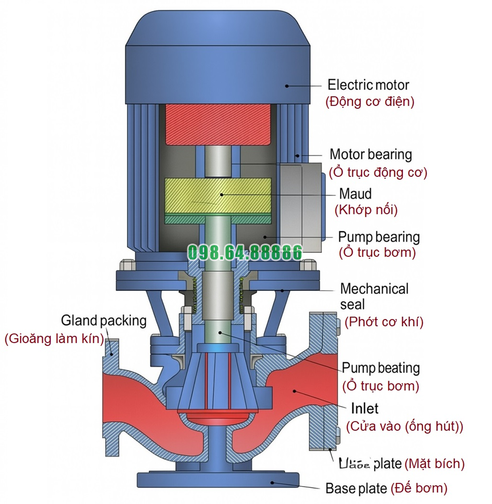 Cấu tạo chi tiết của bơm ly tâm trục đứng ISG80-250B, IRG80-250B gồm thân bơm, cánh bơm, trục bơm, phớt cơ khí, vòng bi, động cơ điện, đế bơm và các chi tiết phụ trợ. Từng bộ phận được chế tạo chính xác, phối hợp đồng bộ, giúp bơm đạt hiệu suất cao, vận hành ổn định, êm ái và có tuổi thọ dài, đáp ứng tốt cho hệ thống cấp nước, HVAC, PCCC và công nghiệp.